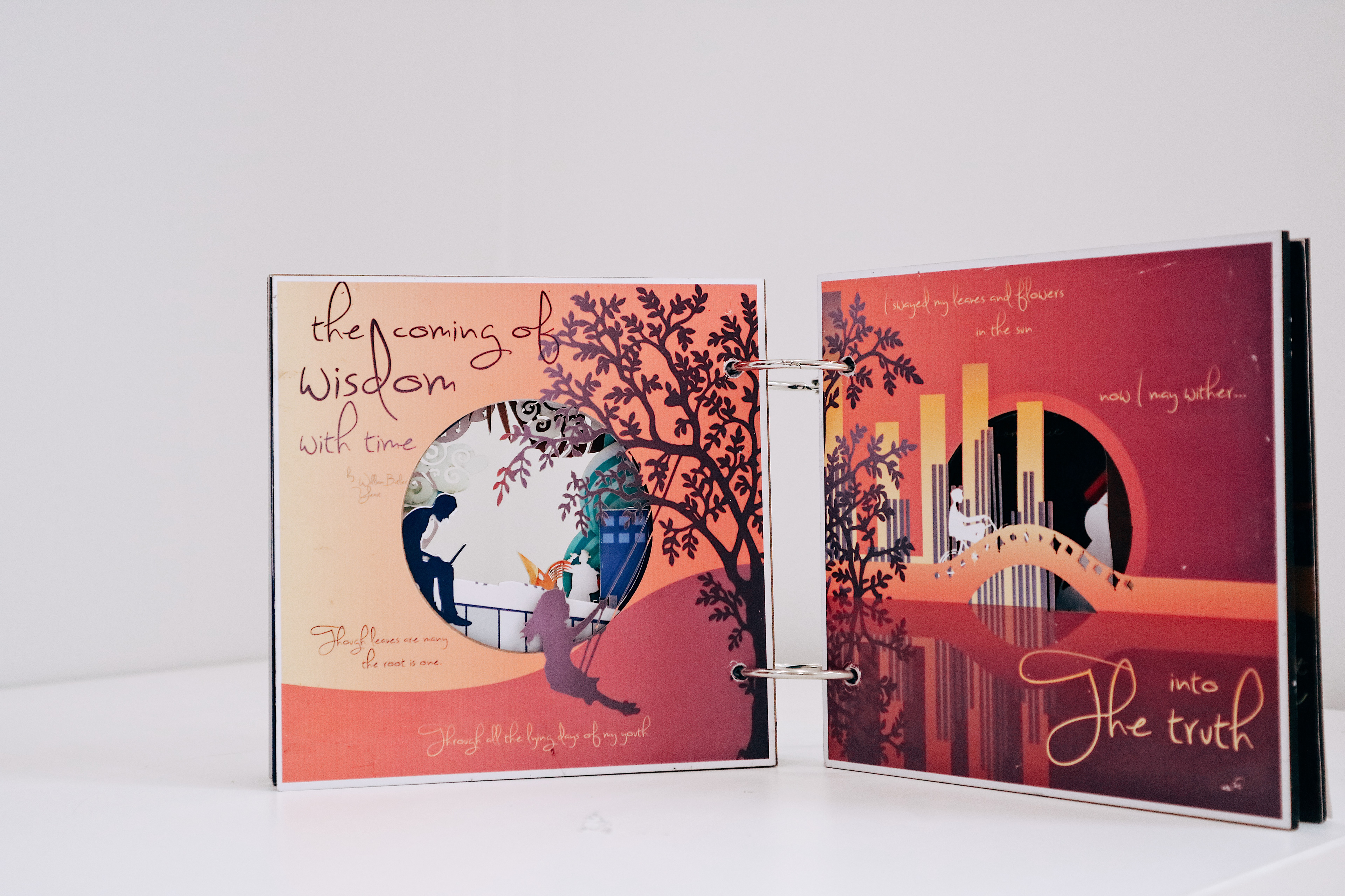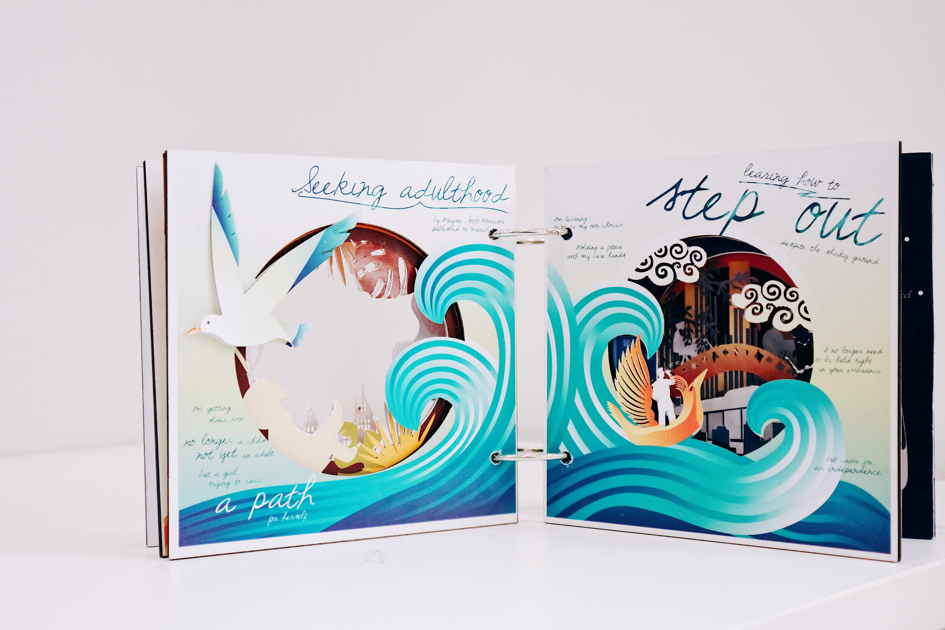 This laser-cut boxes project , which takes inspirations from vintage dollhouses, depicts the life of man through six different stages in life: Infancy, Childhood, Adolescence, Early adulthood, Middle age, and Older age. The highlight of the project is the design and use of wallpapers on each box, which helps communicating the narrative of each stage, at the same time creates that vintage dollhouse look. The laser-cut tunnel book acts as the mini world of all 6 stages, which is constructed in such a way that when you look THROUGH it it gives the effect of looking at a 3-D landscape. Each page is carefully designed to layer nicely on top of each other and create a harmonised look and feel.